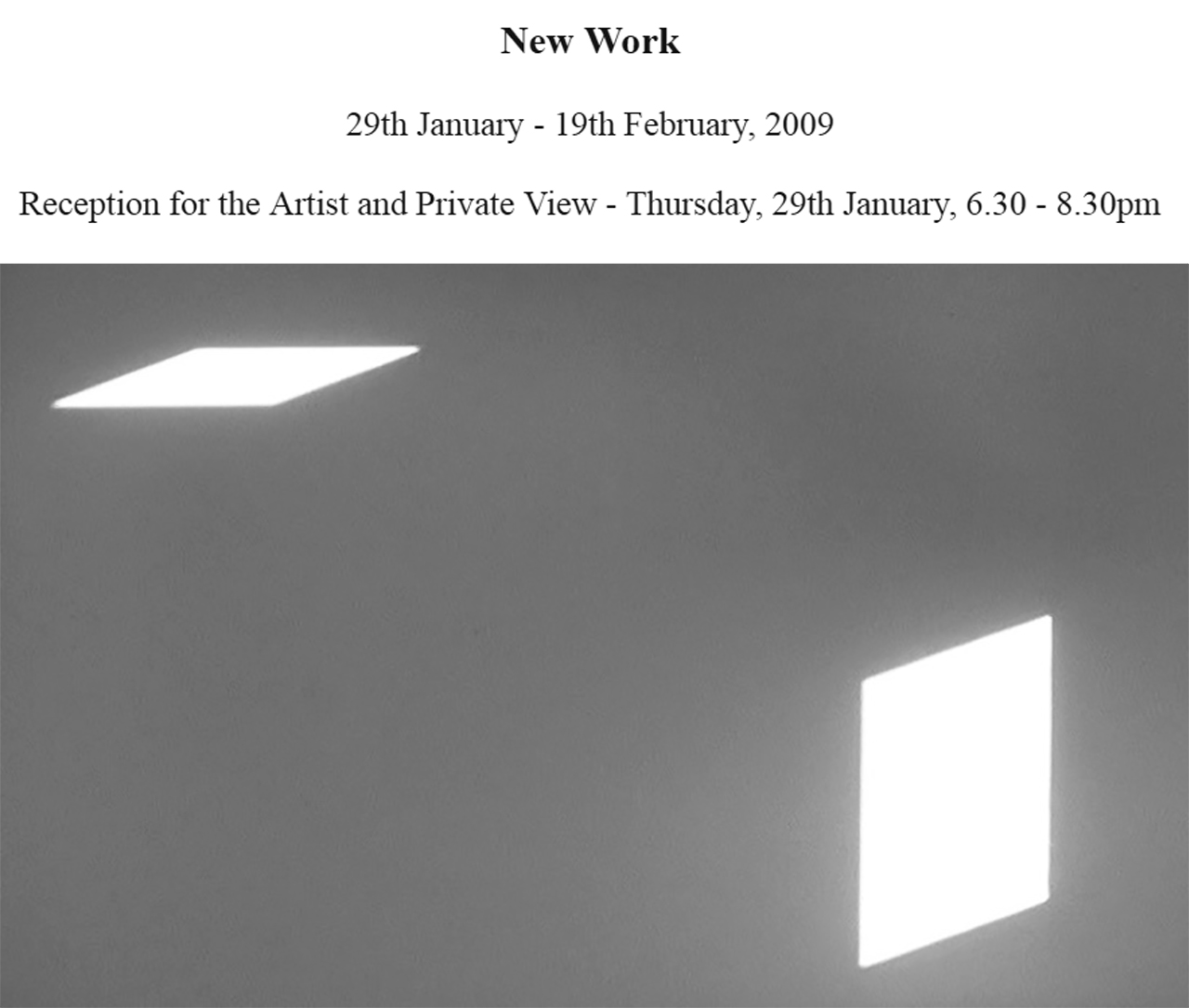 Francisco Ugarte se formó como arquitecto. En su trabajo como artista, es muy clara la inquietud arquitectónica por la distribución de la masa y el vacío además de la luz y el espacio. La proyección de video titulada 9th January 2009, que se encuentra en el espacio principal de la galería, en la planta alta, es una obra que busca extender la galería hacia otro espacio, a un espacio que es un modelo a escala en miniatura de la galería misma, con aberturas para que el espectador pueda observar las formas y las sombras creadas por el tránsito del sol a través del firmamento. Ugarte ubicó la maqueta en la azotea de su domicilio en Guadalajara, exactamente en la misma orientación norte-sur que el salón en Howick Place en la que actualmente se muestra la pieza. Esta particularidad ata irremediablemente a la pieza a su nuevo entorno, aunque dicha pieza fue filmada a miles de kilómetros de distancia, y además realza la inevitable especificidad del contexto: después de todo, el sol no pasa sobre el cielo de Londres de la misma manera en que lo hace sobre el de Guadalajara.