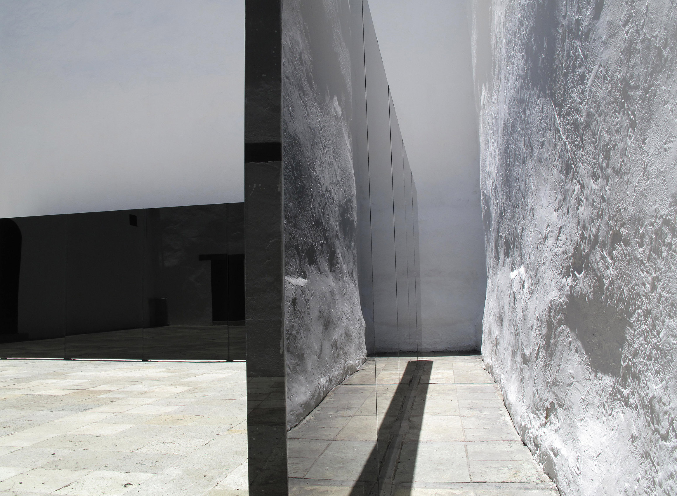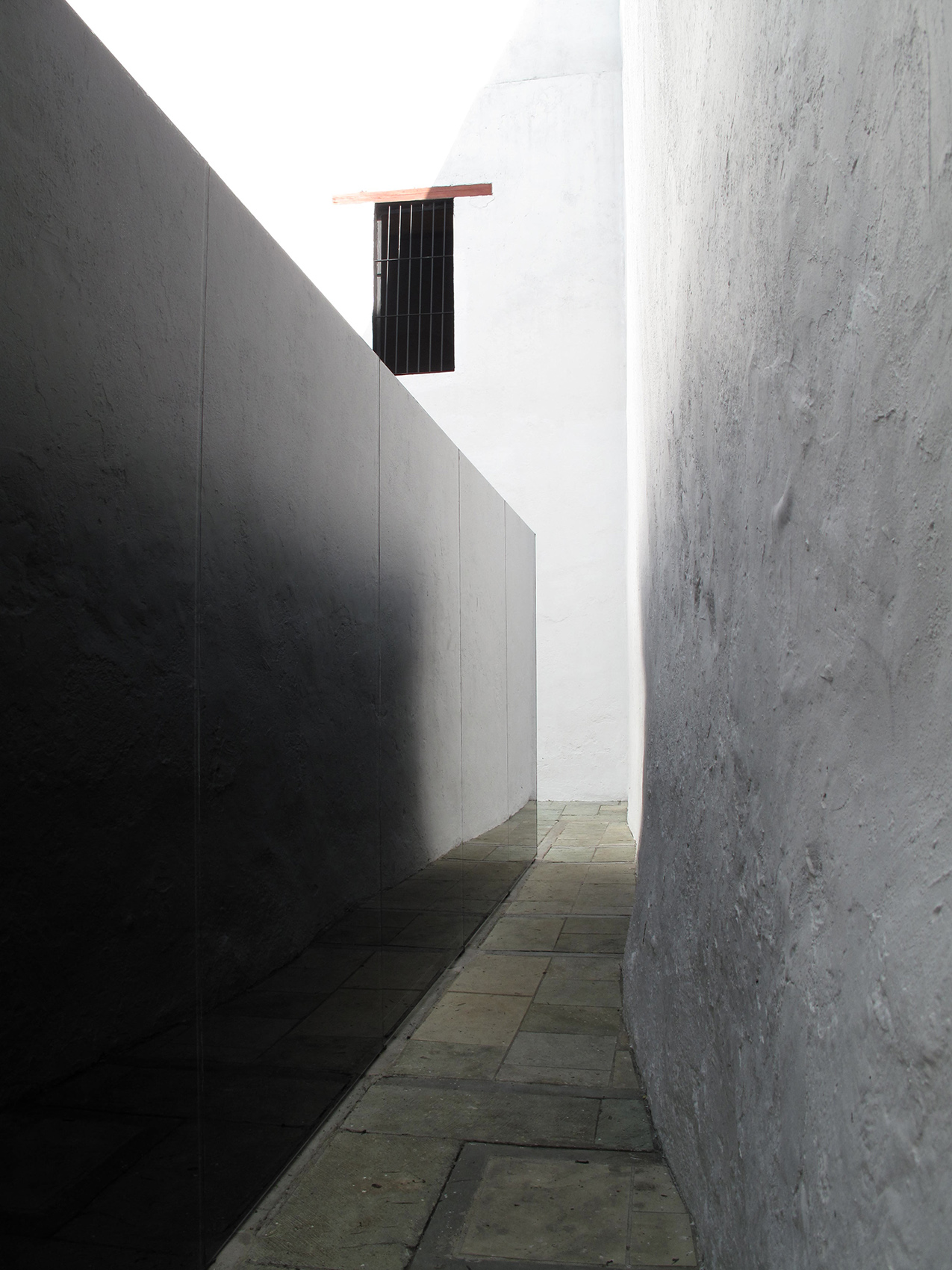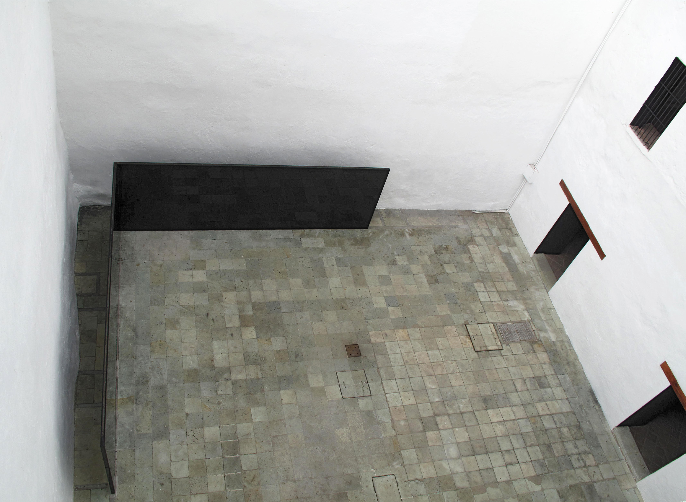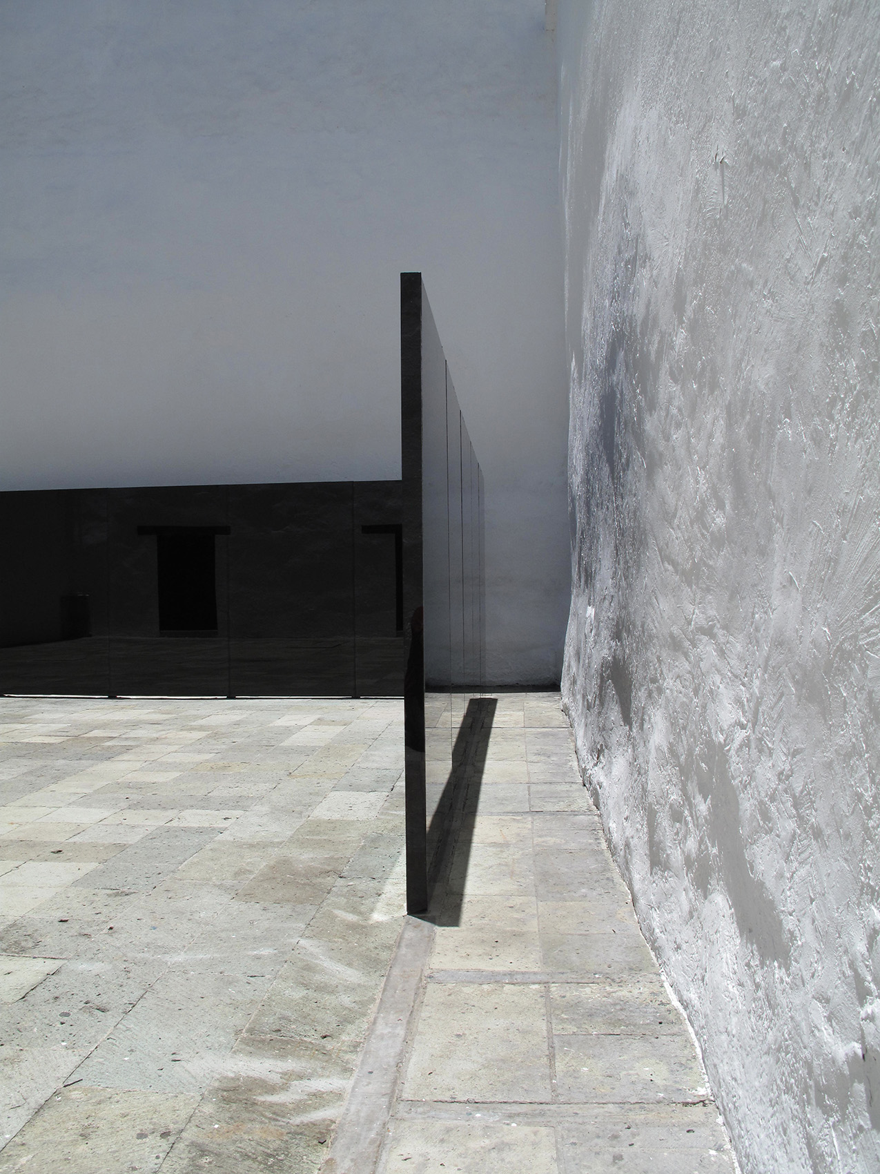 La segunda acción consiste en la instalación en escuadra de dos paredes de vidrio tintado en negro. Su ubicación, en paralelo a una de las esquinas del patio, genera un estrecho corredor de no más de 60 cm. de ancho, que permite al espectador realizar un recorrido que, de nuevo, exalta el enfrentamiento de términos contradictorios. En esta ocasión, a la experiencia, visual y táctil, vivida simultáneamente y en estrecha proximidad por quienes circular por este túnel que tiene una cara (uniforme, tersa y fría) de cristal industrialmente fabricado y otra (irregular, áspera y cálida) de mampostería manualmente ejecutada, se suma el efecto reflejante de la superficie acristalada que reproduce obsesivamente su contraparte opaca.
