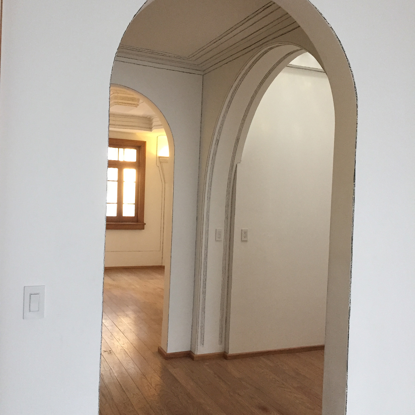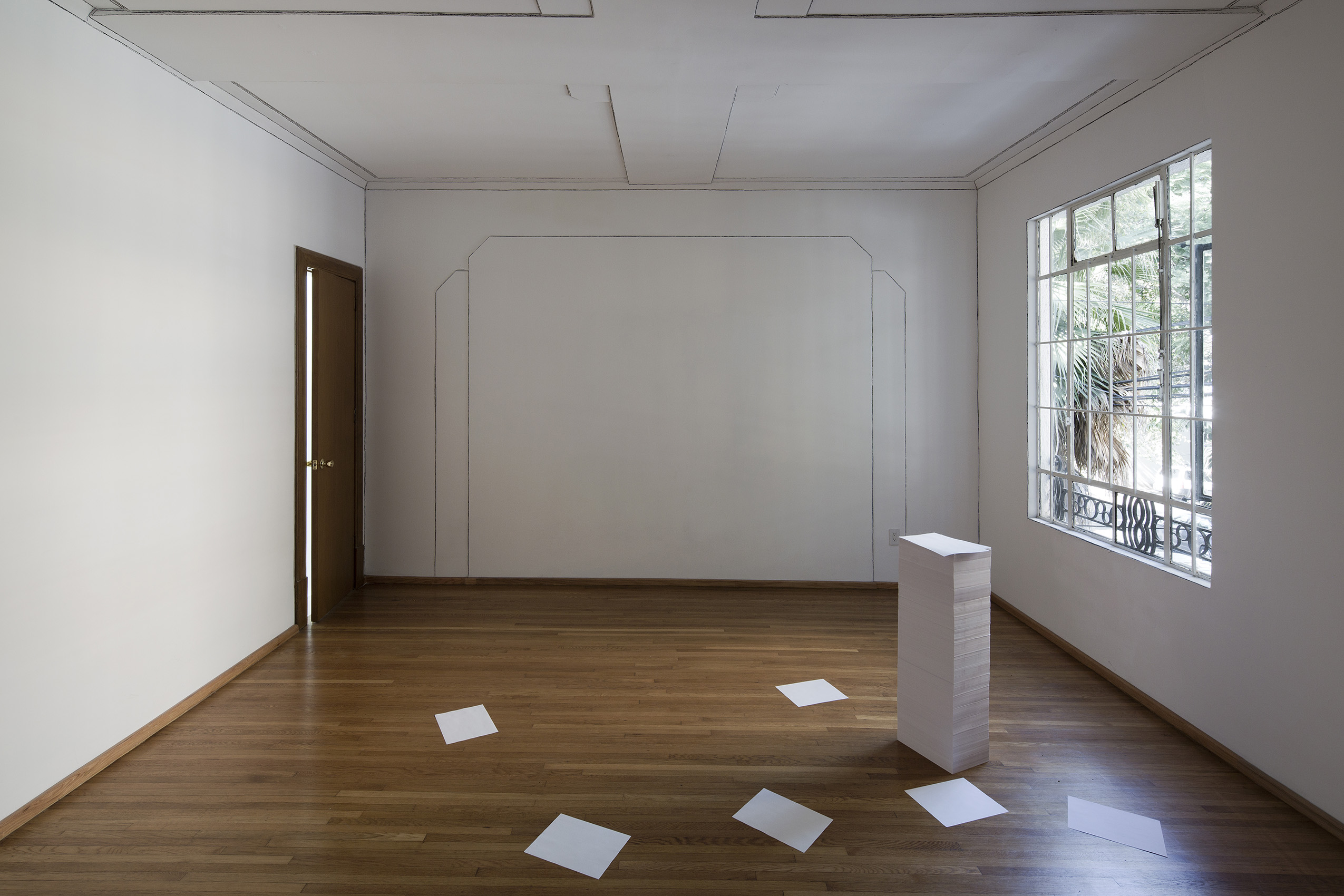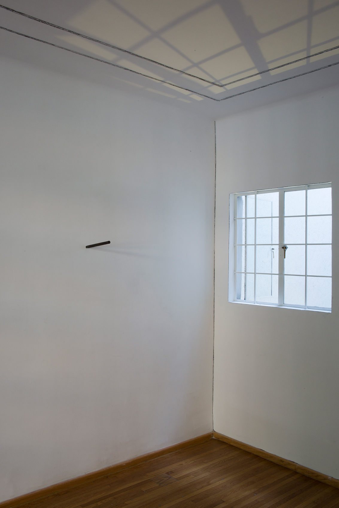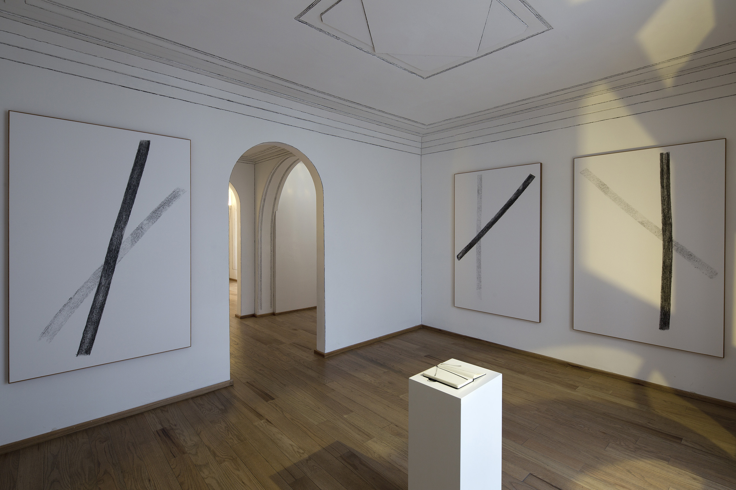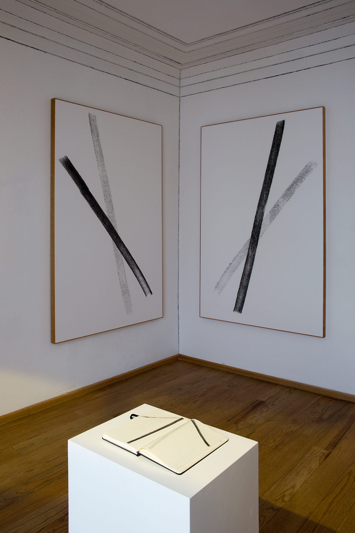 Dos líneas de grafito negro formando una cruz. Una línea más tenue que la otra que surge al empalmar y presionar dos hojas en una libreta, cada hoja con una línea. Una línea es deliberada y la otra no lo es. Luego, la cruz se transporta a una escala mayor, pero esta vez la imagen no es producto de una operación de empalme, sino que es elaborada manualmente, en donde cada línea es resultado de cientos de líneas. Algo que surge de una idea abstracta se convierte en una operación sencillamente artesanal. Dos maneras de imaginar presencia.