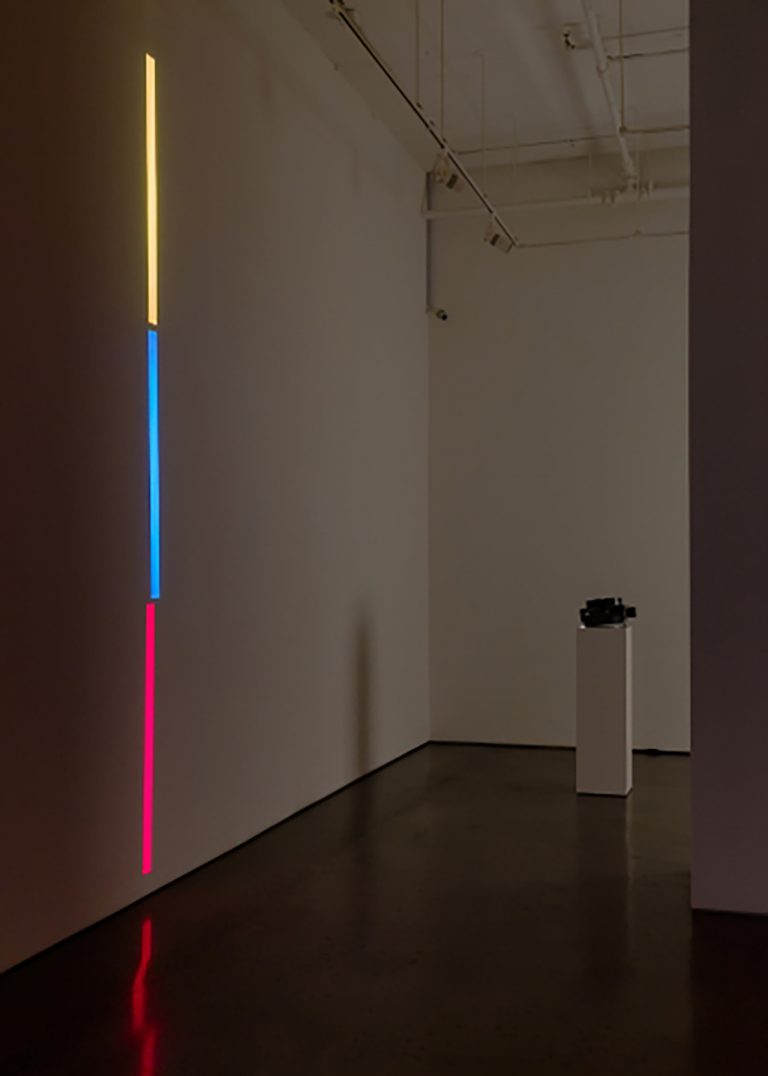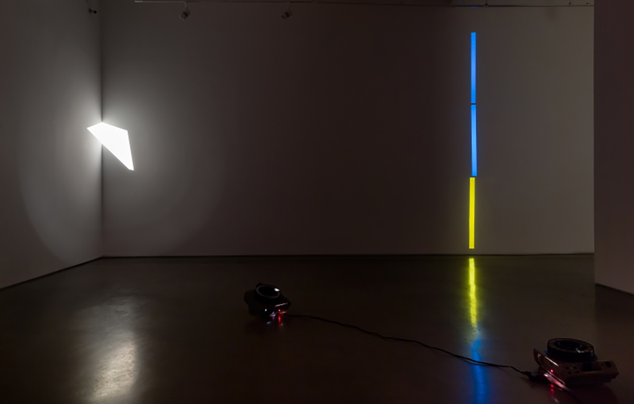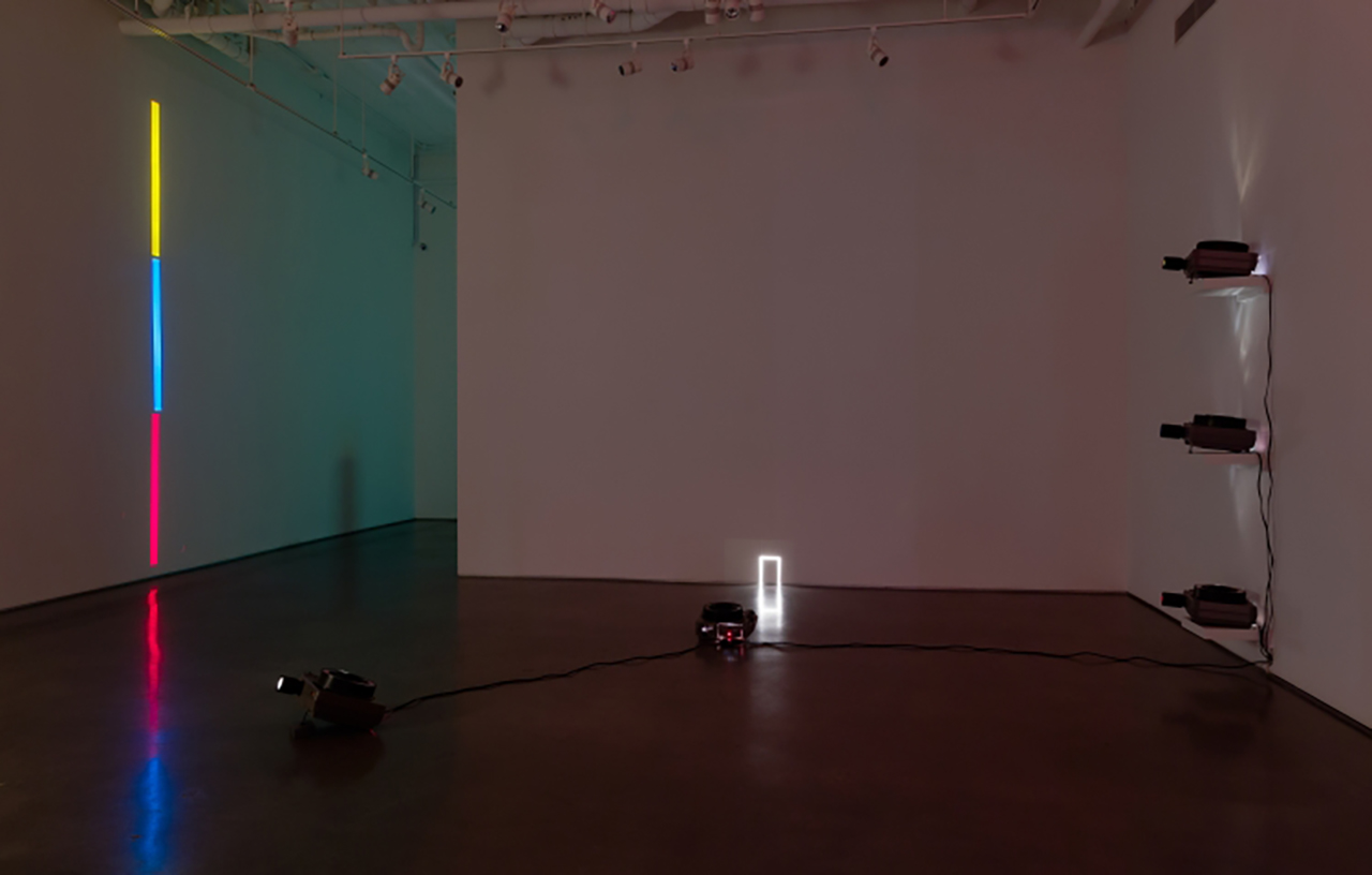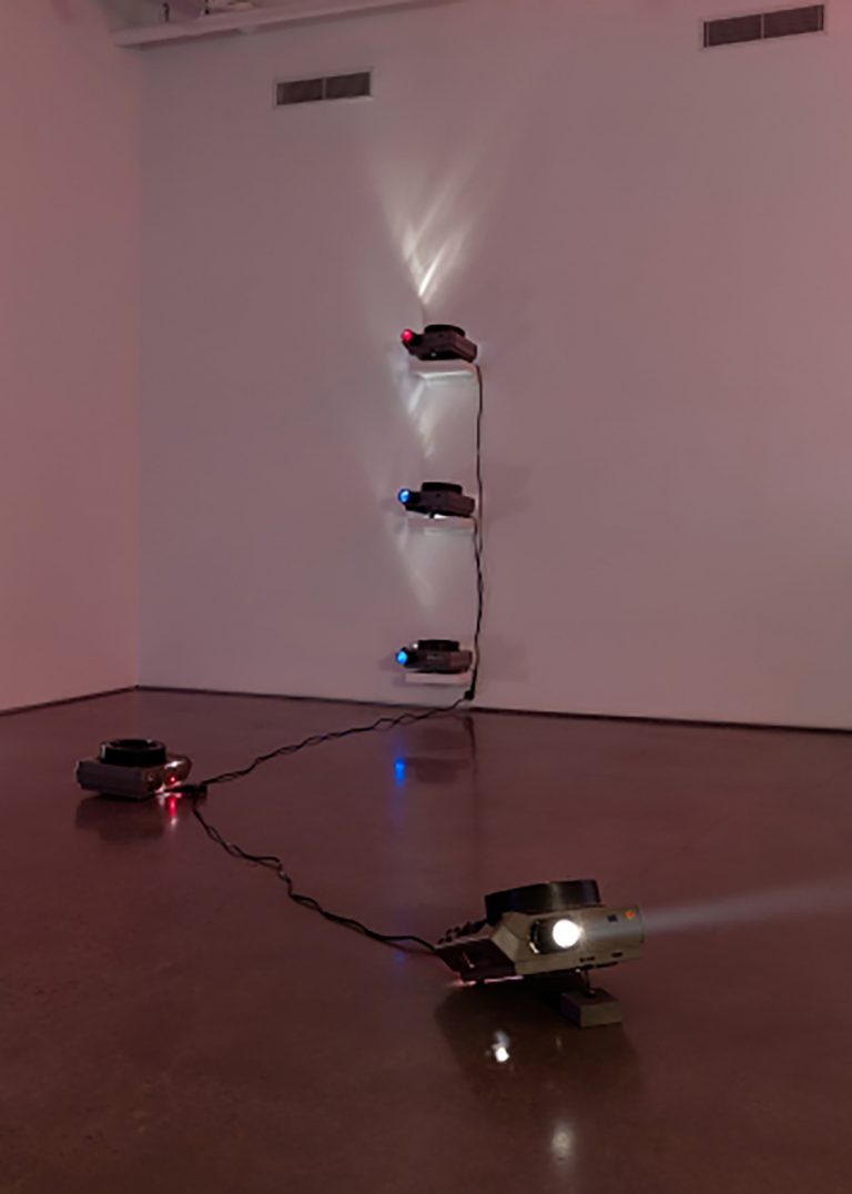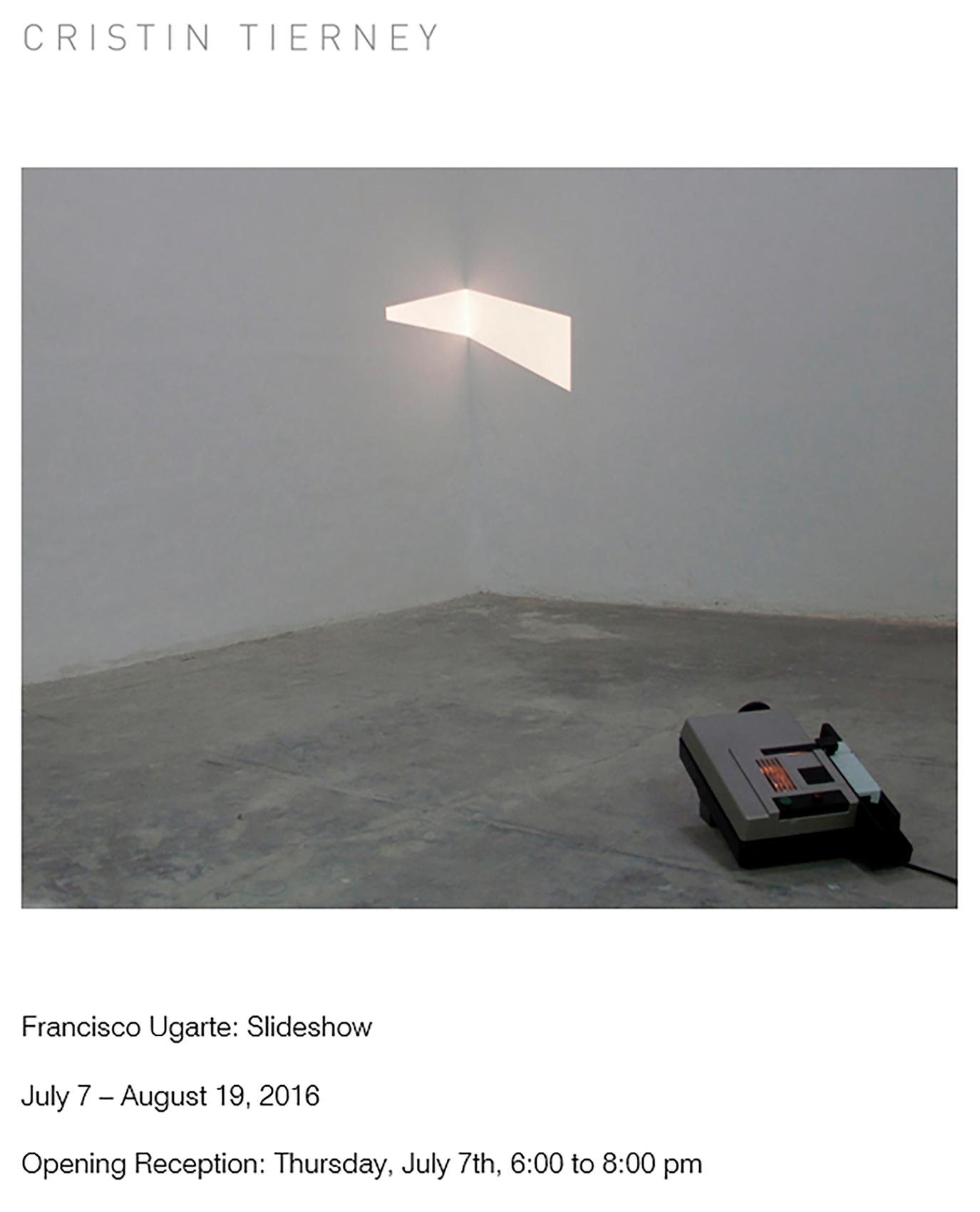 This is only the latest example of Ugarte’s light explorations. Last year, in Sunlight I (2015), he constructed a site-specific sculpture of 11 wooden triangles that chart the movement of the sun like an ancient timepiece. By the same token, “Slideshow” calls upon a nearly obsolete technological tool. However, though the carousel slide projector may be outmoded, its artistic potential still blooms.