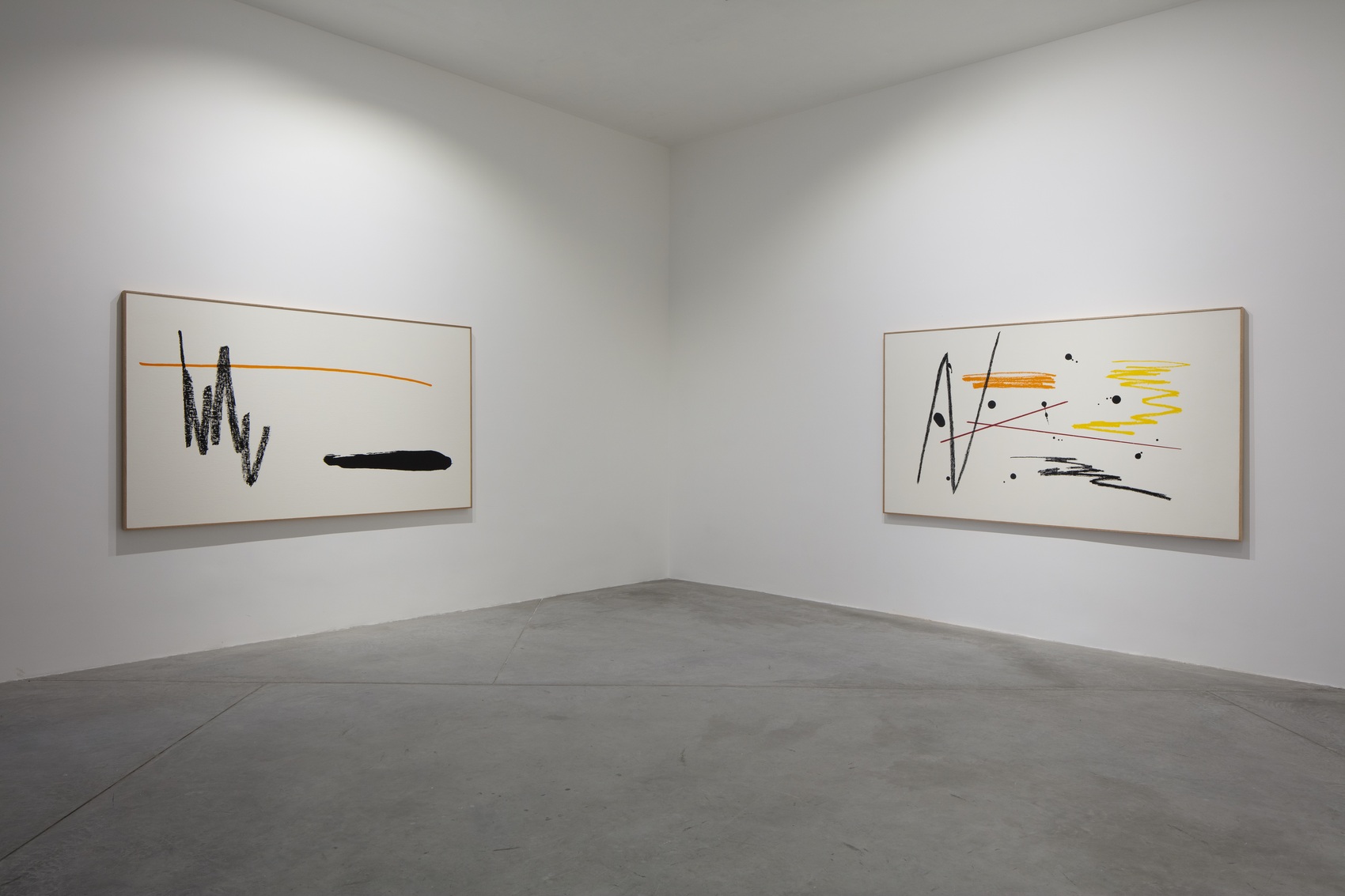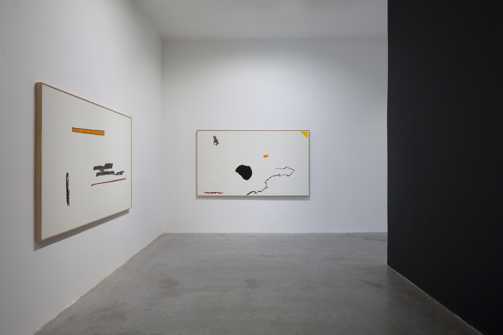 En Paisaje gestual 3, por ejemplo, se despliega un rectángulo amarillo con sus bordes claramente delimit- ados que recuerda algunas de sus investigaciones lumínicas con diapositivas (Rectángulos de colores, 2021) mientras que una sugerente mancha de apariencia accidental se vincula con la solución plástica de su serie de intervenciones Pintura acrílica negra (2013-2018). Del mismo modo, la pintura cuenta con un volumen regular en blanco que, al contacto con una de las líneas horizontales, forma una mancha que se va desvaneciendo, como un gesto a punto de disolverse. En estas pinturas de Ugarte, las superficies blancas operan como una especie de telón de fondo que no cambia y sobre la cual se despliegan elementos y gestos asociables a este tipo de eventos que aparecen, se transforman, pasan. Podrían verse como dibujos esquemáticos de las complejas instalaciones que Ugarte ha ejecutado de acuerdo a las condiciones arquitectónicas de distintos espacios, en las que mediante intervenciones mínimas cromáti- cas, gestuales o accidentales busca alentar una manera distinta de percibir una situación espacial, sub- rayando su estado de continuo cambio y transformación.