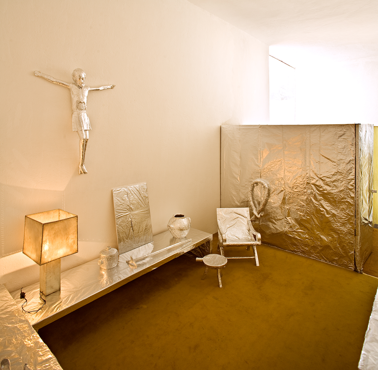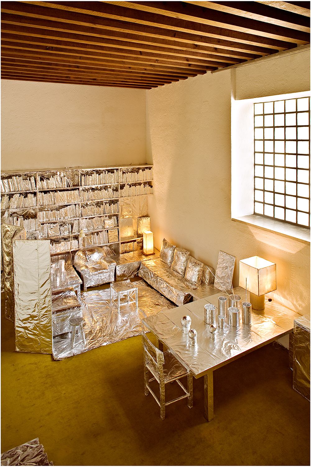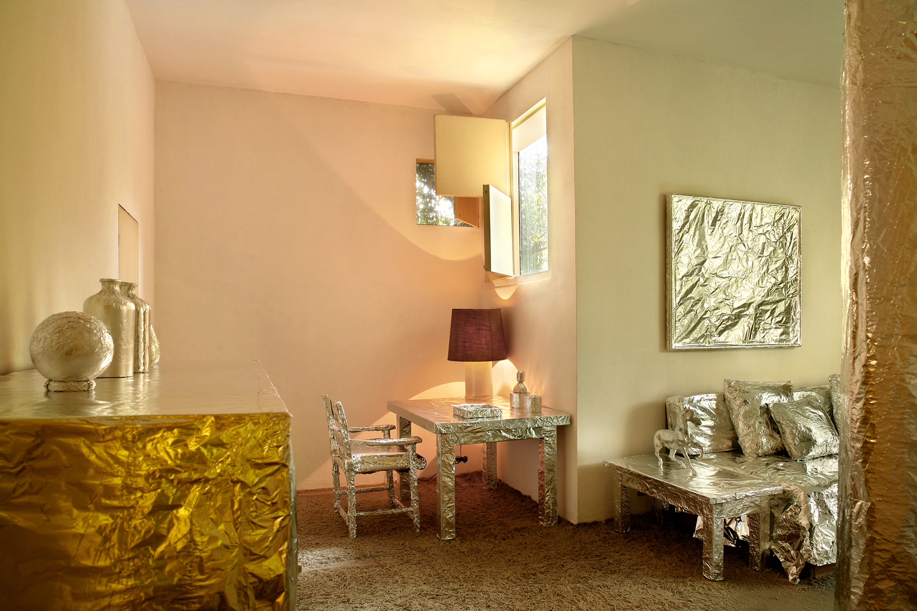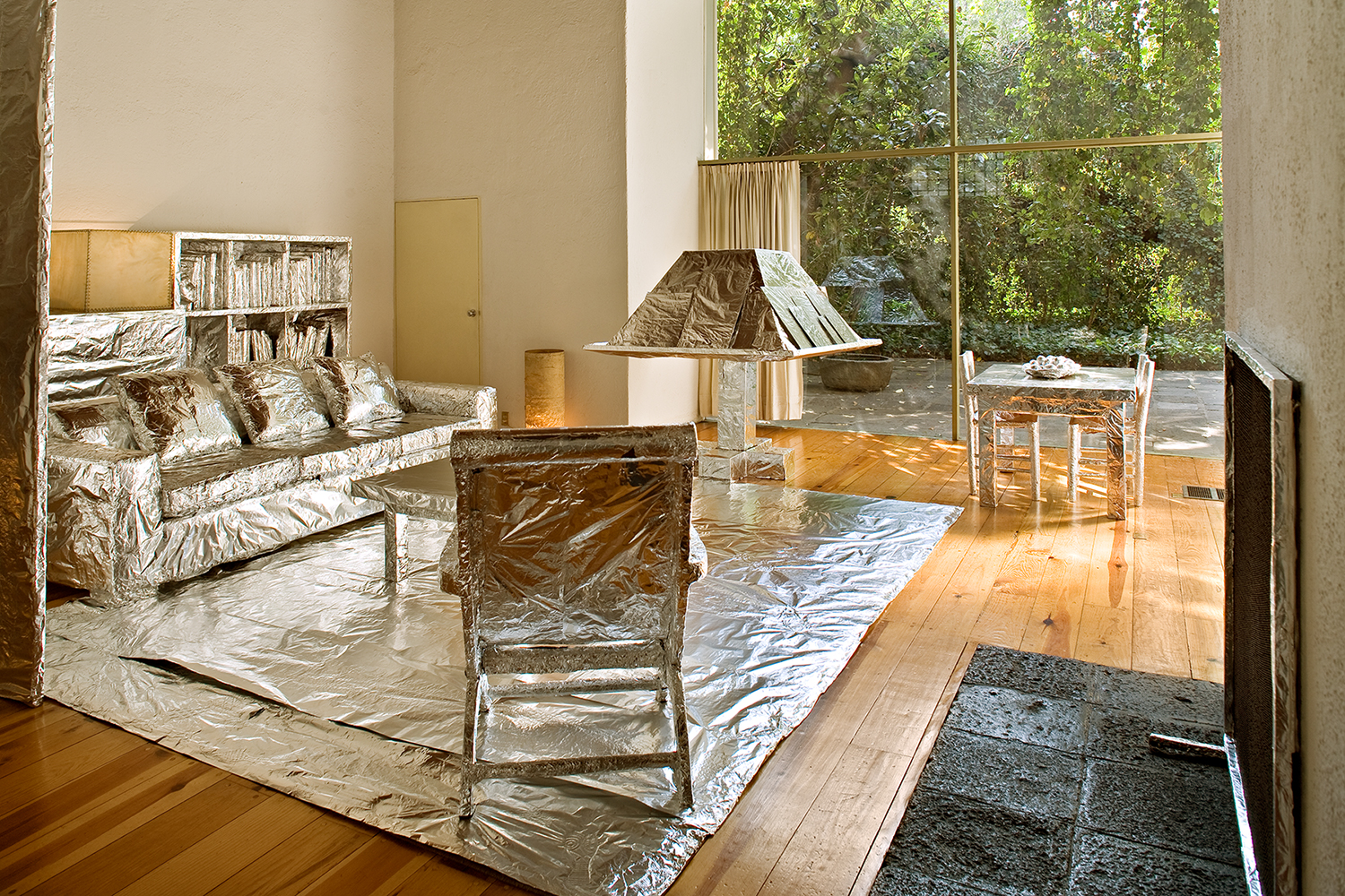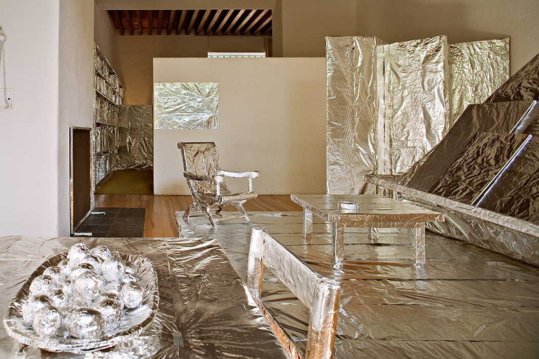 La intervención consistió en cubrir con papel aluminio todos los muebles y objetos -sin incluir las lámparas- de la Casa Luis Barragán.
