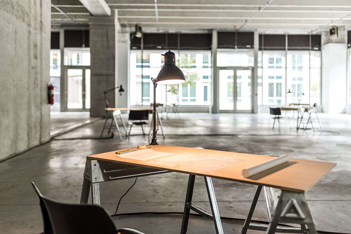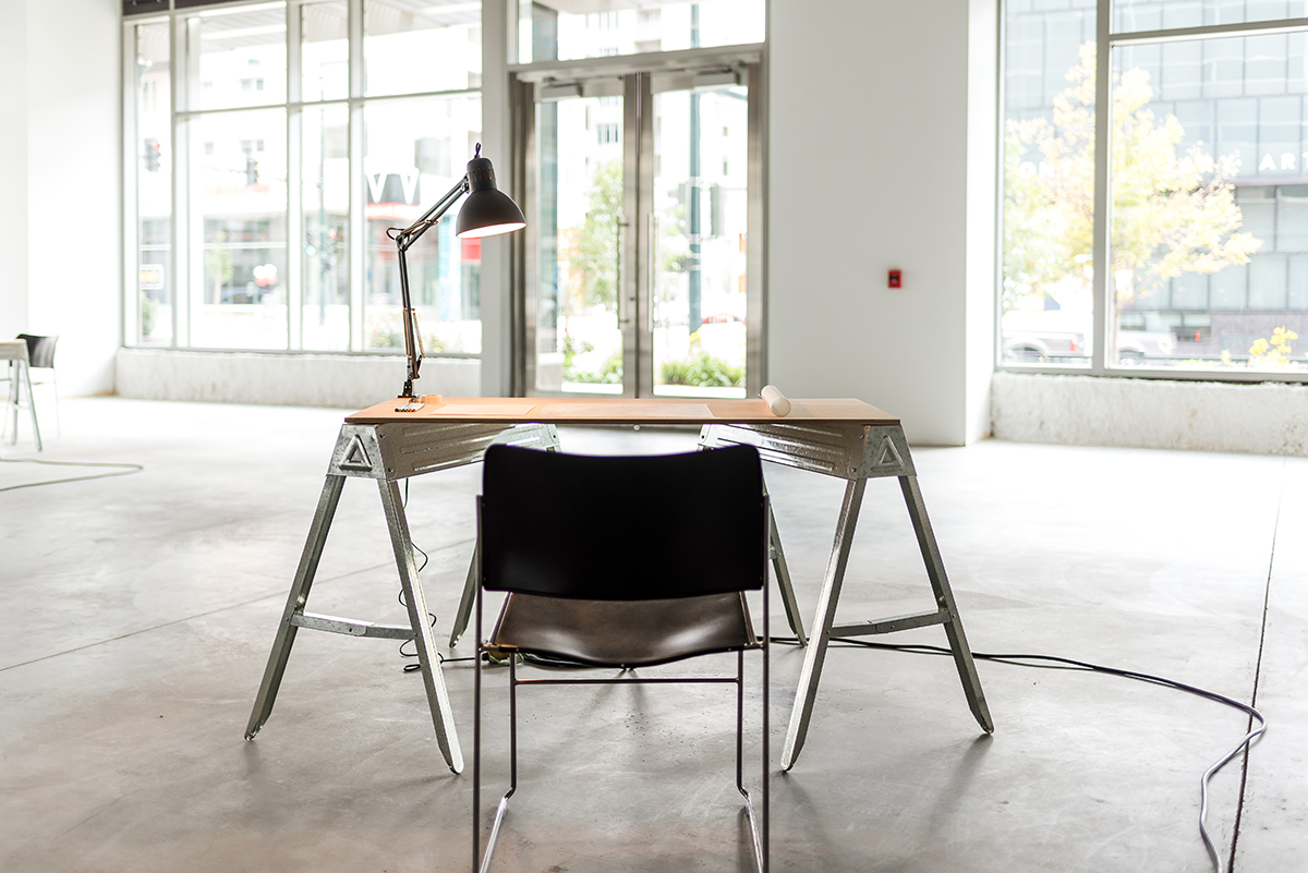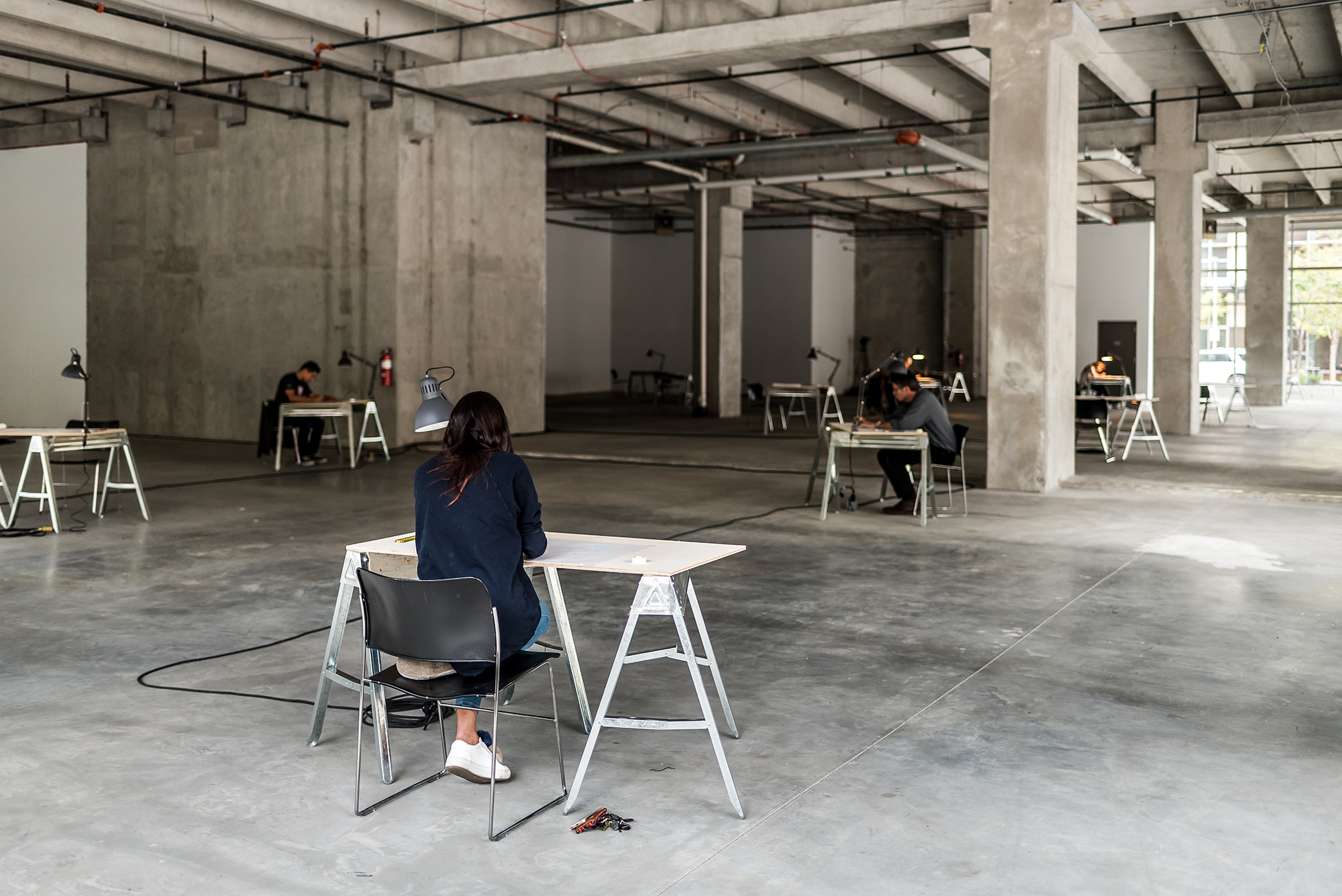 Estaciones de trabajo distribuidas dentro de un local comercial vacío