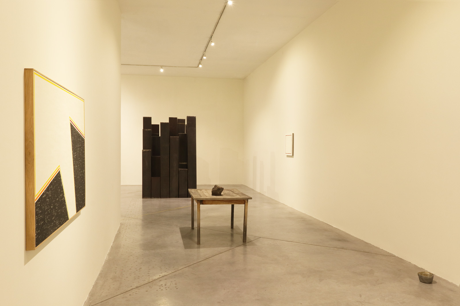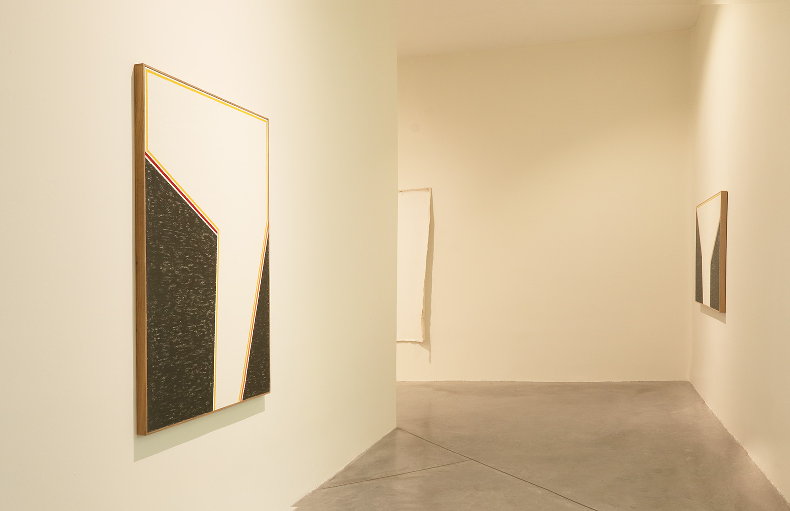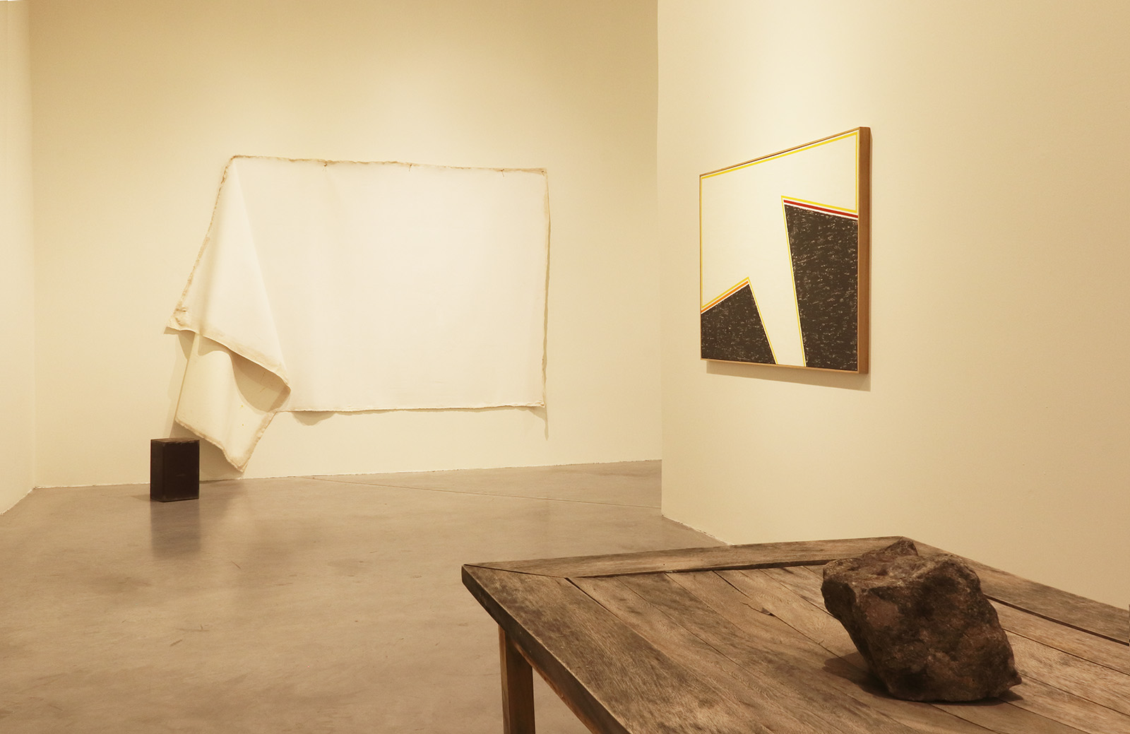 El grupo de obras aquí propuesto tiene una extraña unidad, a pesar de la aparente disparidad de sus componentes. Desde una línea amarilla que cruza el patio del recinto, imantándolo entero, hasta un resplandor dorado que provoca la luz transfigurada con extrema sencillez.